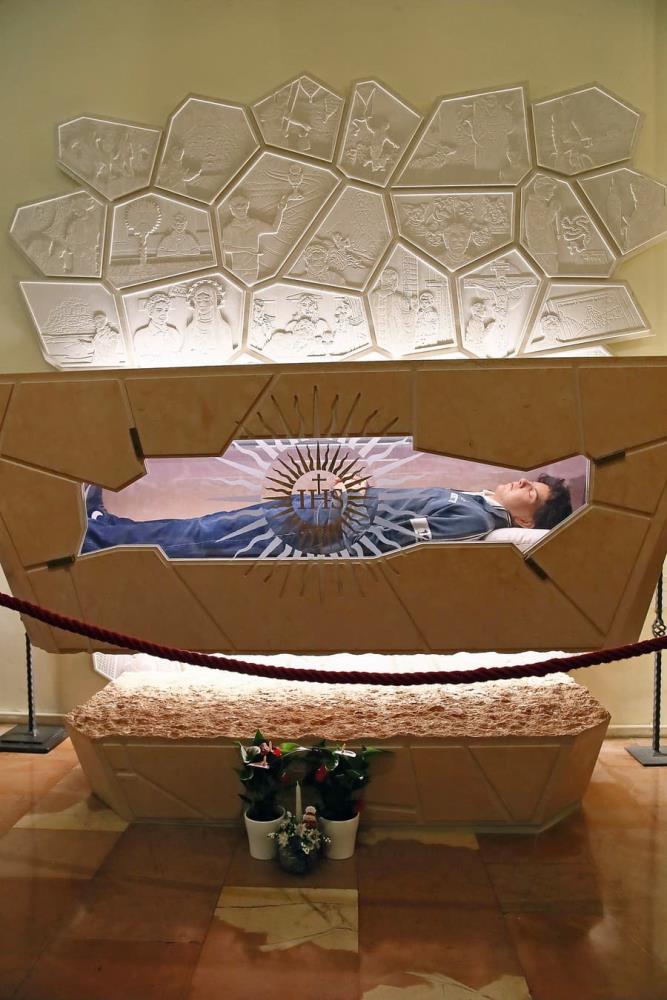 阿庫蒂斯過世後,數百萬青年到亞西西朝聖,他被安放在玻璃棺內,身穿牛仔褲、NIKE運動鞋和帽T,供人瞻仰,看上去就像睡著了一樣。