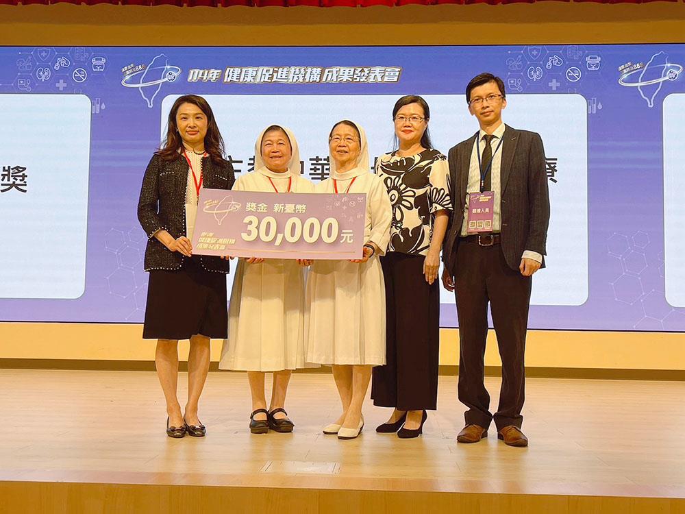 聖馬爾定醫院在國健署「健康促進機構成果發表會」中,以最高總積分勇奪全國績優健康醫院第一名,由院長陳美惠(左二)率同仁上台領獎。