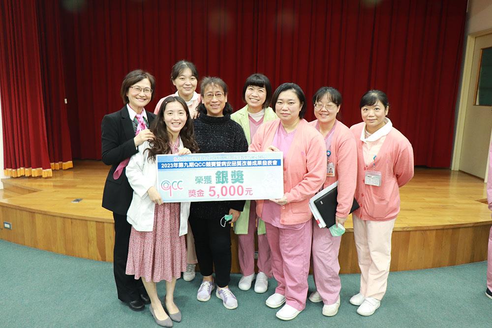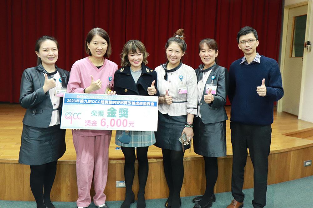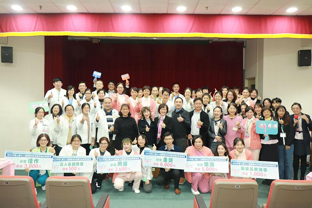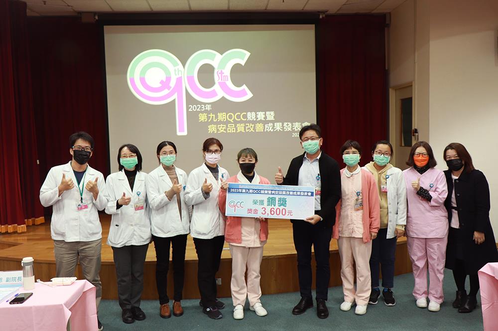 本院品管圈由跨團隊組成,以病人為中心,進行整合性醫療照護,透過各種品管手法,分析改善作業流程,提升病人照護品質。2023年第九期QCC成果發表會,邀請院外品管專家高雄榮總伍麗珠副主任、雲科大工管系柳永青教授,以及院內林慈恩副院長、高智雄特助、曾莉萍特助擔任評審,從不同角度、以不同思維給予團隊建議,同時舉辦高人氣團隊獎票選及各種小遊戲,別出心裁的活動設計為發表會現場活絡氣氛,增添趣味性。
