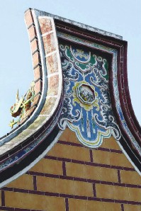 這些漂亮的祖厝,多數經整修過,採用廈門來的彩陶,將屋頂裝飾得色彩繽紛。仔細看,屋頂上安置了一隻隻小小的「螭吻」,據說是龍的次子,具鎮火功效。