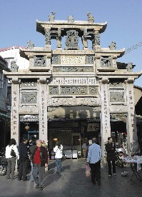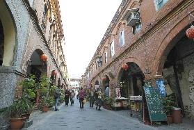 看完牌坊往右走,這裡有一小區商圈,樣子長得像三峽老街,紅磚拱廊留住歲月滄桑,卻是遊客熙來攘往採買土產的勝地。