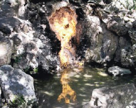 水火同源是關子嶺風景區一大奇景,由於地下瓦斯蘊藏豐富,在泉水湧出處,天然氣也同時冒出,而形成水火同源異象,乍看之下,有如火從水中生,水在火下流,是一處熱門的參觀景點。