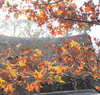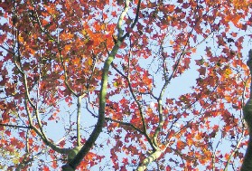 連續冷鋒籠罩後,台南縣關子嶺紅葉公園的青楓正展現如火如荼的姿色,在藍天與青山映襯下,搖曳著一身熱情,絢麗耀眼,景致醉人,吸引許多遊客登嶺觀紅。