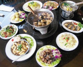 關子嶺有名的溫泉渡假村--景大山莊,就能一次吃遍當地山珍時饈;炸香菇是其中的特色美味,採用新鮮香菇,以絞肉為餡,裹上麵糊炸成,入口外酥內軟,吃得出香菇的鮮香味。軟骨魚也是該餐廳的招牌菜餚,將軟骨魚放入豆瓣醬筍燜熟,滋味甘美。梅汁排骨則是取梅子加上梅汁,酥炸排骨而成,夾雜有甘酸甜兼具的風味。血藤雞湯是將中藥材血藤先以酒泡上三個月至半年,再與土雞一起熬煮,雞肉咬勁夠,酒香、中藥香足,深得口碑。此外,炒脆筍與山豬皮,口感脆又Q,都是口碑載道的名菜。
