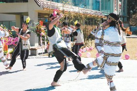 美麗登場的福壽山農場賞花季,恰逢農場遊客服務中心啟用,昨天引來不少賞花嘗鮮客。遊客中心前廣場化為泰雅原住民表演舞台,以歌舞和趣味活動與遊客互動,遊客中心二樓則布置成農特產展場,超大的蘿蔔、烙上字句的蘋果、一盆盆美麗的草花,均吸引遊客欣賞,栽在花盆中的水蜜桃開花,更是引人注目。