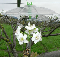 今年初上將梨嫁接,遇到寒流來襲,大家都很緊張,紛紛撐起「梨花專用傘」,果園裡一片傘海,非常奇特;今年天候比去年好多了,新嫁接的花苞開花結果,看到小果實結實纍纍,果農才放心收傘。