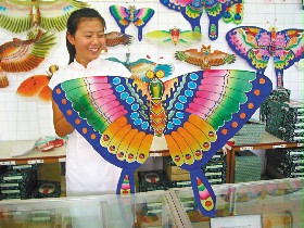 山東遊客雖多,觀光倒不市儈化,大觀園裡風箏製作人員紮枝、畫花、剪紙都很專注,兩人一組,一天生產二到三個風箏。年畫工作坊的師傅頭髮花白,一輩子作版畫仍然按部就班的來。濰坊風箏外銷東南亞最多,由於風箏可拆組,遊客也可帶回去。