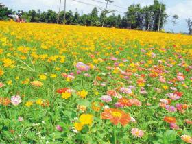 鄭添富進一步以百日草為例說,它是菊科植物,別稱千日草、步步高,花色非常豐富,較常見的有、紅、黃、白、橙、粉紅和紫色等,其中,因百日草的莖呈直立,分枝多且張開呈叢狀,加上植株的高度在15公分到100公分間,進入花期後,因花色非常豐富,迎風搖曳生姿,在繁花盛開時節,走在田埂上,有如在欣賞大地的彩衣。