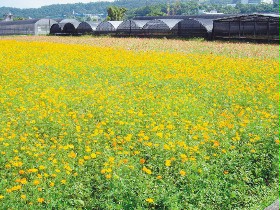 至於,遍布在產業道路兩側的波斯菊,因今年夏天灑下種籽,花色主要有黃色和深黃色,盛開的波斯菊,澄黃一片,「數大就是美」為其特色。