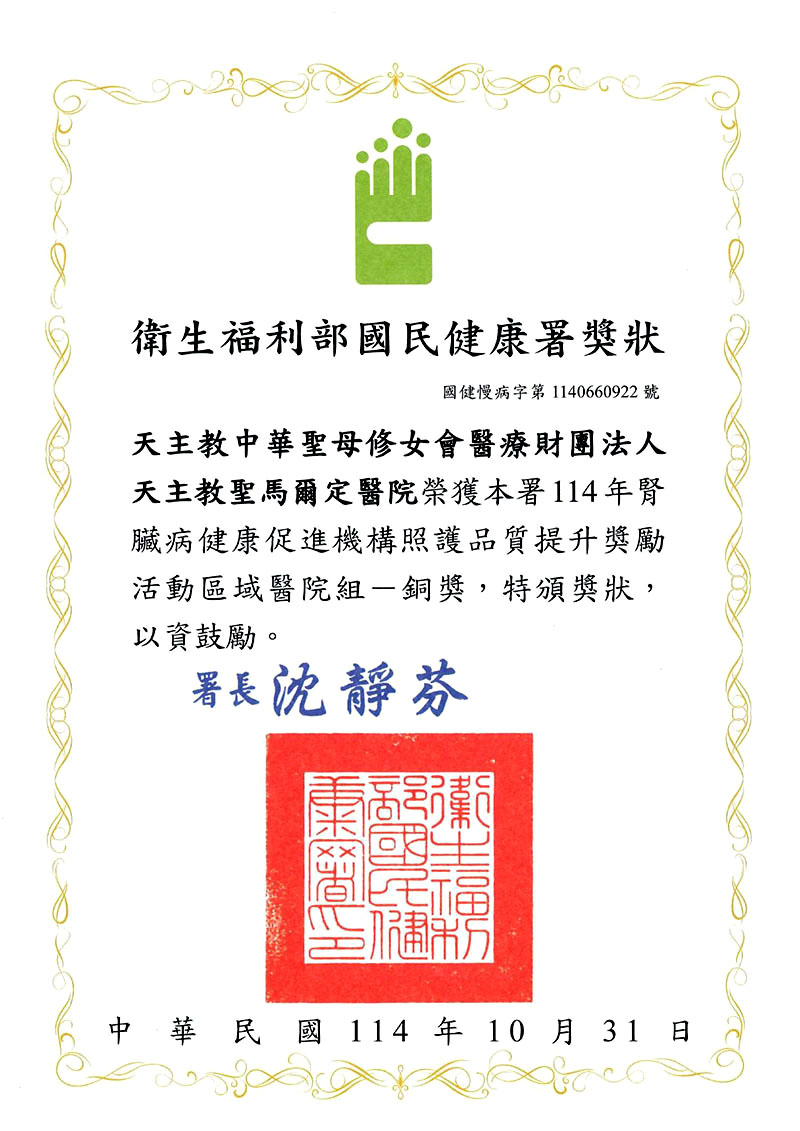 - 國民健康署提升腎臟病健康促進機構照護品質計畫「區域醫院-優等獎」