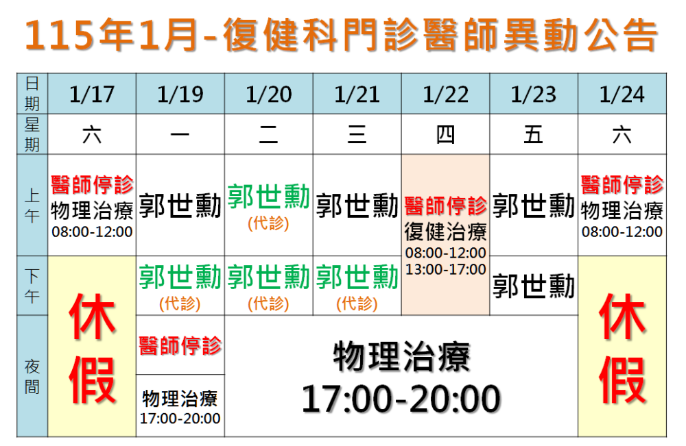 2026年1月17日(六)至2026年1月24日( 六 )門診醫師及復健治療服務時間異動公告
